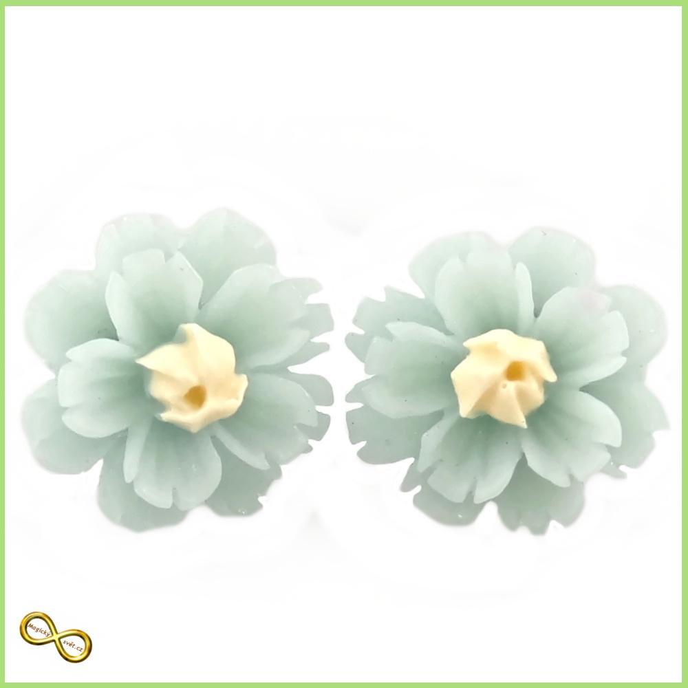 Něžné romantické květinové náušnice v šedé barvě s béžovými středy, typu pecky. Náušnice dodáváme se silikonovými zarážkami, které brání vypadnutí.
